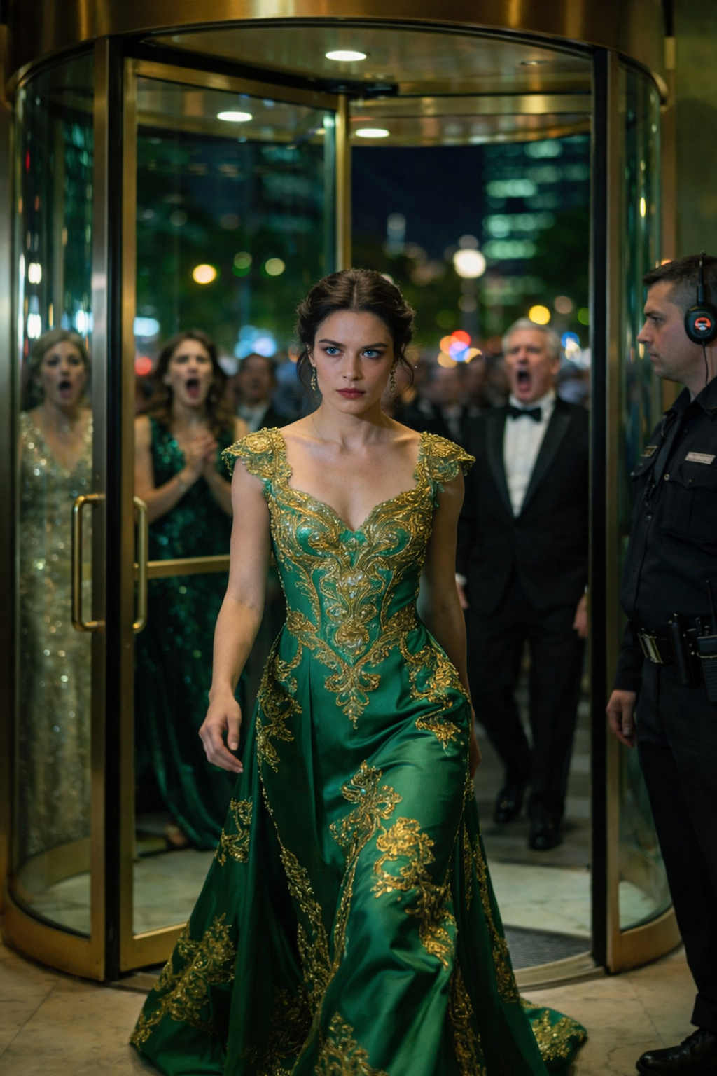 Otočné sklenené dvere hotela Stanton Grand sa leskli vo večernom svetle a odrážali kamery, uniformy parkovacích