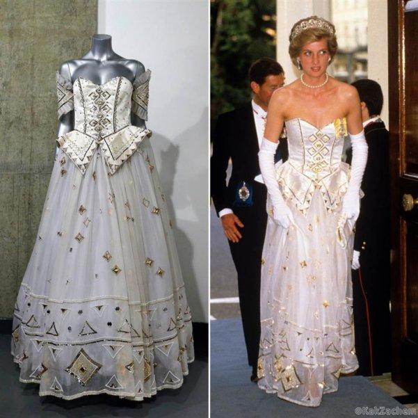 Jej šaty sa považujú za šaty storočia – a je ľahké pochopiť prečo: sú celé pokryté čipkou a výšivkou a je na nich našitých 10 000 perál! Vlečka šiat, ktorej dĺžka je 7,6 m, je najdlhšia v kráľovskej histórii. Princezná musela dokonca absolvovať špeciálne lekcie chôdze s ňou. Šaty sa šili 5 mesiacov a za ten čas sa stali najstráženejšími šatami v histórii.