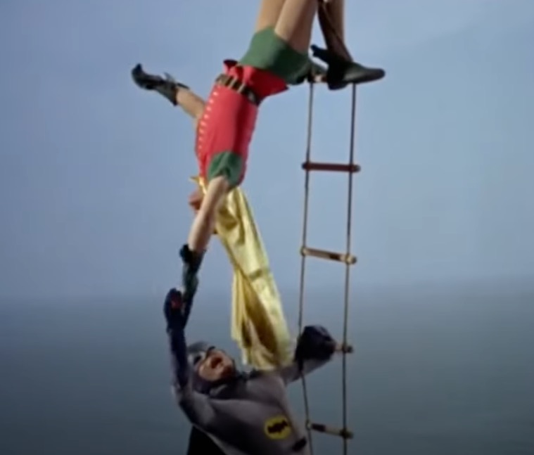 Okrem toho sa uprostred tejto kultovej scény vyskytuje chyba. Keď Robin podáva Batmanovi sprej Shark Repellent Bat Spray, visí hore nohami priamo nad Batmanom. Ale keď Batman použije sprej na žraloka, Robin záhadne zmizne.